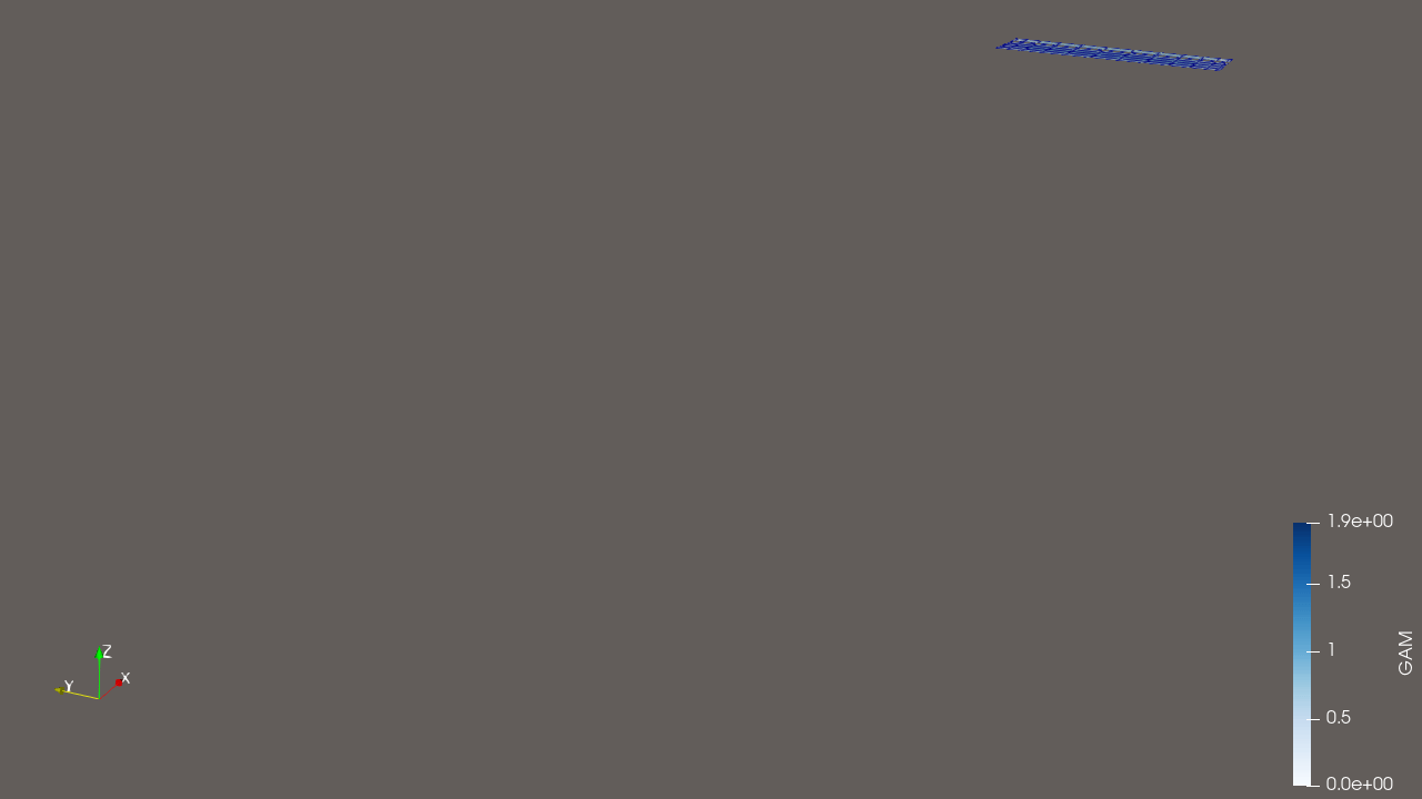 Geometry required for each simulation is defined using the geomXX.nml files, where XX denotes a serial number. We shall simulate a wing of unit chord and aspect ratio 4. For the geom01.nml file, the relevant section is shown below. The parameter theta0 represent the wing pitch angle and the nomenclature is borrowed from rotorcraft conventions. The freestream velocity is set to 10 m/s using the vector velBody. Note the axis conventions used here. The negative sign is present since we are setting the velocity of the geometry which is towards the negative direction in an inertial coordinate frame.